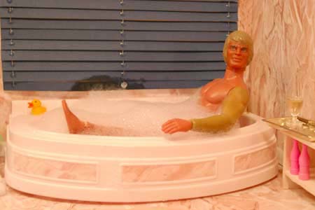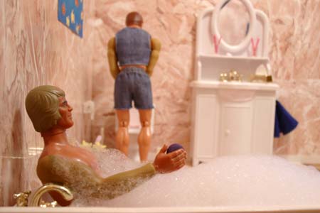 Im Bad der Männer-WG. Jeff und sein Quietsche-Entchen nehmen ein duftendes Schaumbad. |