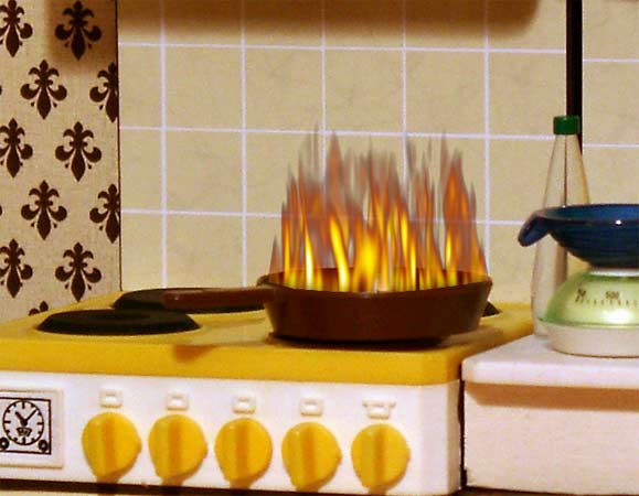 Oh nein, die Pfanne hat Feuer gefangen. Der gute Fisch... Gleich brennt die ganze Bude ab. |