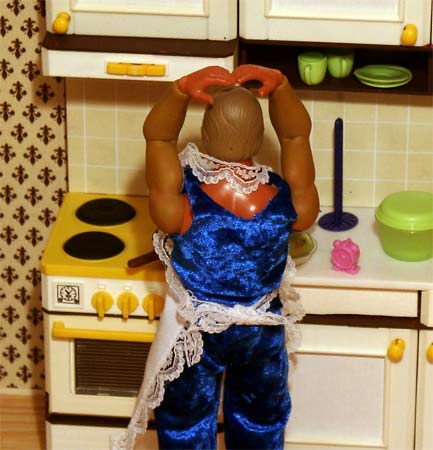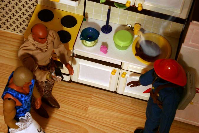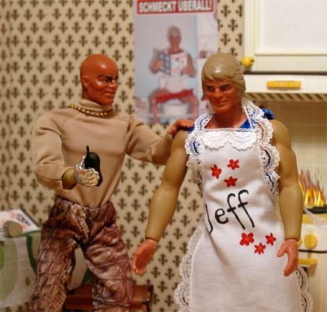 Einfach die Pfanne ins Spühlbecken, kaltes Wasser rüber und fertig, da hätten unsere Jungs aber auch selbst drauf kommen können... Dr. Steel hat schon wieder das Telefon in der Hand, wen ruft er denn jetzt noch an??? Und Jeff? Seine Schürze braucht er heut nicht mehr, er hat genug. |