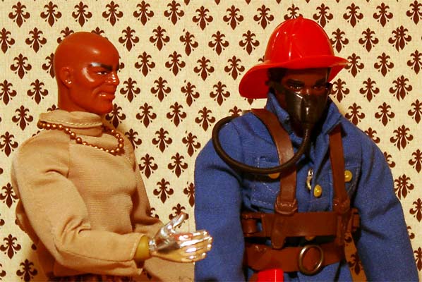 Als Entschädigung bekommt der Feuerwehrmann auch erstmal ein Bier. Das hat er sich verdient. Jeff will alles über seinen Beruf wissen, in dem tragen alle Männer blau, und blau steht ihm doch auch so gut. |