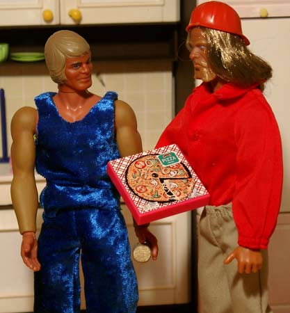 Plötzlich klingelt es an der Tür, Jeff öffnet dem Pizzajungen! Steeli hat mitgedacht! Ein pfiffiges Kerlchen! |