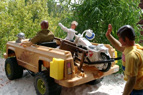 Wegen Evels noch größer gewordenen Dachschadens bringt Josh ihn nach Hause. Feuer- und Schaukelstuhl passen wunderbar auf den Pick-Up.