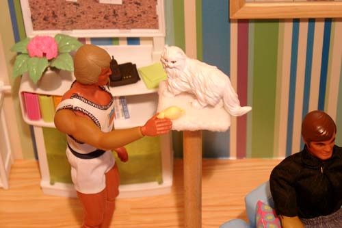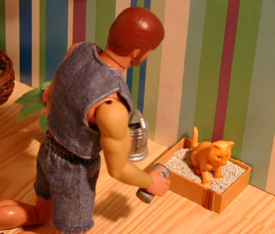 Auch Josh kommt ins Haus. Der aber ohne Katze, dafür mit einem selbstgebauten Kratzbaum und mit einem Katzenklo. Jeff ist so gerührt. |